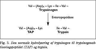 Trypsinogen er et inaktivt proenzym, som secerneres fra de acinære celler i pancreas, og som normalt aktiveres i tarmlumen af børstesømsenteropeptidasen enterokinase. Enterokinase spalter trypsinogen ved aminosyren lysin til det N-terminale trypsinaktiveringspeptid (TAP) og aktivt trypsin (Fig. 3 ). Trypsin aktiverer i tarmlumen de resterende proteaser fra pancreas (14). Aktiveres trypsin intraduktalt i pancreas udløses akut pancreatitis. En række faktorer beskytter mod aktivering af trypsin intraduktalt. Det primære forsvar ligger dels i enterokinasens lokalisation til børstesømmen i tarmen, dels i en lav intracellulær calciumkoncentration, som hæmmer intracellulær trypsinogenaktivering samt i produktion af SPINK1. Sidstnævnte inaktiverer trypsin og trypsinogen ved at spalte disse ved det proteolytiske kløvningssted. Ud over denne primære beskyttelse er der et sekundært forsvar i trypsins selvhæmmende effekt. Trypsin aktiverer enzym Y og mesotrypsin, som sammen med trypsin selv kan inaktivere trypsiongen og trypsin (15). Af andre trypsinhæmmende faktorer skal nævnes α -1-antitrypsin og β -2-mikroglobulin, der begge produceres i leveren. Disse virker især, såfremt den acinære celle skulle blive ødelagt, og trypsin sive ud i det ekstracellulære rum (14).