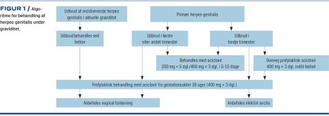 Da forekomsten af herpes genitalis blandt gravide er relativt høj, og den potentielle smitte af den nyfødte kan være yderst alvorlig, er klare retningslinjer for diagnostik og behandling af gravide med herpes genitalis vigtig. I 2019 reviderede Dansk Selskab for Obstetrik og Gynækologi (DSOG) den eksisterende guideline for håndtering af herpes genitalis under graviditet og fødsel. Af væsentlig betydning i klinisk praksis er den nye anbefaling om profylaktisk antiviral behandling fra graviditetsuge 36 + 0 til gravide med udbrud af genital herpes under graviditeten [5] (Figur 1).