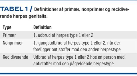 Klinisk inddeles herpes genitalis i tre grupper: primær, nonprimær og recidiverende herpes genitalis (Tabel 1).