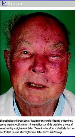 Reaktiv involvering af centralnervesystemet (CNS) ses både under og efter HZ-udslættet. Patien-terne har lette eller ingen tegn på meningeal irritation. I spinalvæsken ses typisk lymfocytær pleocytose og et let forhøjet proteinniveau. Symptomerne svinder spontant uden behandling. En sjælden og alvorlig CNS-komplikation er akut eller kronisk meningoencefalitis, hvor virus og intratekal antistofsyntese ofte kan påvises i spinalvæsken. Andre mulige neurologiske komplikationer er myelitis, polyradiculitis og som beskrevet pareser af hjernenerver og perifere nerver (Figur 2) [8, 9]. Derudover forekommer kontralateral hemiparese betinget af vaskulitis i uger til måneder efter zoster.