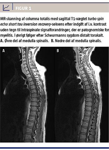 Efter fem døgn fik patienten tiltagende hovedpine, svimmelhed, bredsporet, usikker gang, hyppig vandladning, sensorisk ataksi i under- og overekstremiteterne, reduceret vibrationssans i begge ben, bilateralt livlige reflekser med venstresidig overvægt samt et vesikulært smertefrit udslæt på det venstresidige TH5-dermatom. Endvidere fandt man VZV-DNA i cerebrospinalvæsken ved en PCR-undersøgelse, men intratekal syntese af VZV-antistof blev ikke påvist. En MR-skanning af cerebrum og columna totalis viste normale forhold fraset Scheuermanns sygdom distalt torakalt (Figur 1). En røntgenundersøgelse af thorax viste normale forhold.