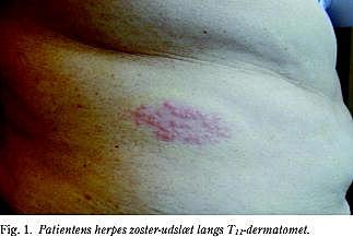 En 54-årig kvinde blev indlagt med pludseligt indsættende højresidige flankesmerter på mistanke om fastsiddende uretersten. Ved den objektive undersøgelse var patienten øm i højre nyreregion og angav, at der ud over smerter var en ubehagelig fornemmelse ved berøring af flanken. Der var ingen hudforandringer i området. Biokemisk var S-kreatinin normal og CRP var let forhøjet (16 mg/l). Urinstiks var +++ for blod, men en akut i.v.-urografi viste normale forhold. Det var nødvendigt at behandle patienten med NSAID og mor-phin for holde hende smertefri. Tre dage senere fik hun et makulopapuløst udslæt i højre flanke (Fig. 1 ) ud for T11 -dermatomet. Man havde herefter formodning om en infektion med varicella zoster-virus, og hun blev sat i behandling med aciclovir 800 mg × 5 i syv dage. Ved en ambulant kontrol efter fem uger fandt man en stigning i varicella zoster-IgG, mikroskopisk hæmaturi blev ikke observeret. Patienten kom sig i løbet af en uge.