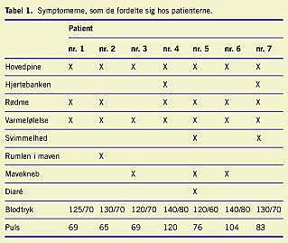 En 30-årig kvinde henvendte sig på skadestuen med kraftig, dunkende hovedpine, rødme af ansigt, hals og bryst samt kraftig hjertebanken. Symptomerne begyndte kort efter indtagelse af en tunburger. Objektivt fandtes kvinden blussende, med normalt blodtryk (125/70) og puls (68), der var ikke hævelse af tunge eller svælg. Patienten blev behandlet med intravenøs injektion af clemastin 2 mg og methylprednisolon 80 mg. Samtidig henvendte seks af patientens kollegaer sig på skadestuen alle havde spist tunburger til frokost og udviste i varierende grad symptomer på histaminforgiftning. Alle havde rødme af ansigtshuden, varmefornemmelse og dunkende hovedpine. Flere havde mavekneb og hjertebanken, enkelte brændende fornemmelse i munden eller svimmelhed. En enkelt havde diaré. Alle havde normalt blodtryk, hvorimod to af havde takykardi (104 og 120) (Tabel 1 ). Alle blev behandlet med antihistamin og efter få times observation udskrevet fra skadestuen i velbefindende og uden symptomer.