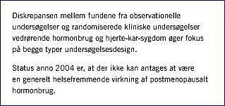 Diskrepansen mellem fundene fra observationelle undersøgelser og randomiserede kliniske undersøgelse vedrørende hormonbrug og hjerte-kar-sygdom øger fokus på begge typer undersøgelsesdesign. Stiller man samme spørgsmål? Er undersøgelserne gennemført med tilstrækkelig omhyggelighed? Sammenlignes samme ekspositioner? Sammenlignes samme sygdomme? Opspores alle tilfælde, også tidlige? Er der bias? Observationelle studier har fortsat sin berettigelse, da de er hurtige og billigere at gennemføre, og i mange spørgsmål lader en dobbeltblind randomisering sig ikke gøre.