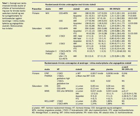 Resultater vedrørende kvinder kom i slutningen af 1990'erne fra de første randomiserede undersøgelser, hvor 2.763 kvinder, der havde haft en blodprop i hjertet, blev randomiseret til kombineret østrogen-gestagen-behandling eller placebo (HERS, Tabel 1 ) [2, 3]. I 2001 fulgte ligeledes et sekundært præventionsstudie med 663 kvinder, der lige havde haft iskæmisk apopleksi. De blev randomiseret til østrogen eller placebo (WEST, Tabel 1) [4]. I ingen af undersøgelserne påvistes der en sekundær beskyttende effekt af hormoner over for udvikling af fornyet blodprop i hjertet eller fornyet apopleksi, tværtimod. I kølvandet på disse resultater fulgte overvejelser om, hvorvidt hormoner havde en anden effekt hos kvinder med manifest aterosklerotisk sygdom end hos raske kvinder. Ved en reanalyse af observationelle data fra den amerikanske Nurses' Health Study fandt man heller ingen beskyttende effekt af hormonbehandling af kvinder, der havde hjertesygdom [5].