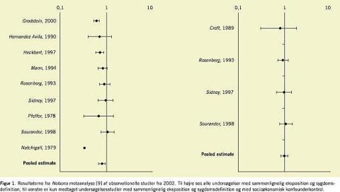 De første resultater kom imidlertid før forventet, da den undersøgelsesarm, hvor 16.608 kvinder med intakt uterus var blevet randomiseret til kombineret østrogen-gestagen-behandling eller placebobehandling, blev stoppet i foråret 2002. Baggrunden var, at ulemperne generelt oversteg fordelene ved hormonbehandlingen. Overraskende fandtes der ingen beskyttende effekt over for hjerte-kar-sygdomme, tværtimod fandtes en øget risiko for koronar hjertesygdom og apopleksi, ud over den forventede øgede risiko for brystcancer [7, 8]. Resultaterne fra epidemiologiske undersøgelser stod nu i kontrast til fundene fra randomiserede kliniske undersøgelser. Der blev derfor gennemført en fornyet metaanalyse af epidemiologiske undersøgelser i 2002, hvor man kun sammenholdt undersøgelser, der tålte sammenligning hvad angår ekspositionsdefinitioner og slutmålsdefinitioner, og kun medtog artikler, der korrigerede for socioøkonomiske forhold (Figur 1 ). I denne metaanalyse fandt man ikke en beskyttende effekt af hormonbrug over for myokardieinfarkt, og man fandt en øget risiko for apopleksi [9].