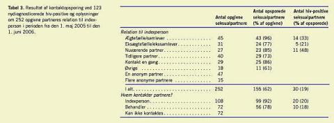 Kontaktopsporing blev tilbudt til 123 indexpersoner. Der var 107 indexpersoner, der ville medvirke til kontaktopsporing. Hos de 16 indexpersoner, der ikke ønskede at deltage, var årsagen uoplyst. Der blev i alt opgivet 252 partnere dvs. i gennemsnit 2,4 partnere pr. indexperson, der deltog i kontaktopsporing. De, som var blevet rådgivet om smitteveje, sikker sex, postekspositionsprofylakse (PEP) og § 252 (en hiv-smittet, der udsætter sin partner for smitte med hiv, kan straffes, hvis partneren ikke ved, at der er en risiko for at blive smittet) opgav fire gange så mange partnere pr. indexperson som de, der ikke fik rådgivning om disse emner. Der blev i alt opsporet 155 partnere, dvs. at der i gennemsnit blev opsporet 1,4 partnere pr. indexperson, der deltog i kontaktopsporing. Den primære årsag til, at partnere ikke blev opsporet, var, at personen var bosiddende i udlandet, eller at det drejede sig om anonyme kontakter. De opgivne partneres relation til indexpersonen fremgår af Tabel 3. Resultatet af kontaktopsporing fordelt på hospitalerne fremgår af Tabel 1. Af de opsporede partnere blev 126 (81%) hiv-testet. Der blev i alt fundet 30 nye hiv-positive. Dette var i gennemsnit 0,28 ny hiv-positiv pr. indexperson, der deltog i kontaktopsporing. Der var 12 (40%) af de 30 nye hiv-positive, der påbegyndte antiviral behandling for hiv ved konstatering af hiv-diagnosen.