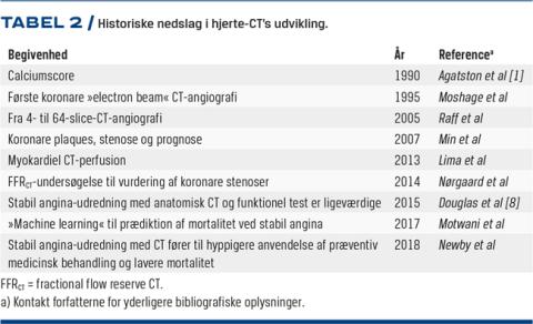 Der er udviklet nye værktøjer til at forbedre vurderingen af stenoser ved hjerte-CT (den positive prædiktive værdi). Ud over ovennævnte FFRCT, der karakteriserer koronart flow og anvendes flere steder i Danmark, drejer det sig bl.a. om CT-myokardieperfusionundersøgelse. I et nyligt publiceret randomiseret studie påviste man, at tillæg af en CT-perfusionsundersøgelse reducerede antallet af KAG-undersøgelser og koronare interventioner, uden at antallet af kardiovaskulære hændelser blev øget [28], og dynamisk perfusion testes aktuelt. Hjerte-CT ved non-ST-elevationsinfarkt er for nylig blevet undersøgt og har vist høj negativ prædiktiv værdi [29]. I andre studier undersøger man hjerte-CT udført med meget lave stråledoser og reduceret brug af kontrast. Tekniske fremskridt giver bedre mulighed for at skanne overvægtige og patienter med arytmier. Derudover er der bl.a. forskningsinteresse i potentialet for machine learning ifm. koronarevaluering. Tabel 2 viser nedslag i hjerte-CT’ens historie.