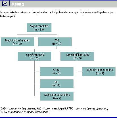 Samlet set fik 18% (39/215) af de patienter, der blev henvist til hjerte-CT, foretaget supplerende KAG. Ved KAG havde 56% (22/39) af disse patienter signifikant CAD, mens 49% (19/39) fik foretaget revaskulariserende behandling. Af den samlede patientkohorte fik 9% (20/215) foretaget KAG uden efterfølgende revaskulariserende behandling.