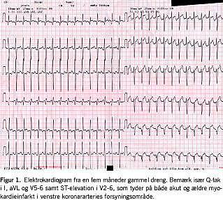 På formodning om astmatisk bronkitis blev der iværksat behandling med hyppige terbutalininhalationer på en forstøver, men den følgende dag var han respiratorisk forværret. Infektionsparametrene var uændrede, men på røntgen af thorax sås et venstresidigt infiltrat og et overraskende stort hjerte. På mistanke om kardial inkompensation blev der givet furosemid intravenøst og ilttilskud, og en akut overflytning til børnekardiologisk center blev forberedt. Patienten blev imidlertid hurtigt dårligere. Et elektrokardiogram (ekg) viste sinustakykardi med Q-tak og ST-elevation i flere afledninger (Figur 1 ). Inden drengen kunne stabiliseres til transport, fik han respirationsstop og asystoli. Intensiv genoplivning var uden effekt.