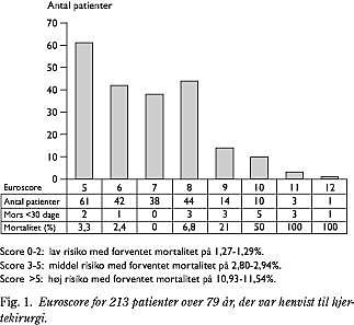 Den optimale udvælgelse af 80-årige til hjertekirurgi er vigtig, men også vanskelig. En del patienter over 79 år, der har behov for et hjertekirurgisk indgreb, vil ikke kunne tåle det kirurgiske traume. De 80-årige patienter har en nedsat funktionel reservekapacitet pga. aldersforandringer i bl.a. hjerte, nyrer og lever (4). Desuden har mange 80-årige en eller flere risikofaktorer, der øger den operative risiko. I nærværende undersøgelse blev alle patienter risikostratificeret iht. Euroscoresystemet (1). Vi fandt, at patienter med en score på 9 eller mere havde en betydelig øget postoperativ mortalitet, mens patienter med en score på under 9 havde stort set den samme mortalitet som patienter under 80 år. Dette tyder på, at man skal være meget varsom med at operere højrisikopatienter over 79 år med en score på 9 eller derover. På den anden side indicerer Euroscoresystemet, at alderen alene nok øger den operative risiko, men at patienter over 79 år ikke bør afvises til hjertekirurgi alene pga. alderen.