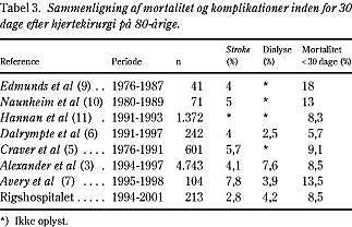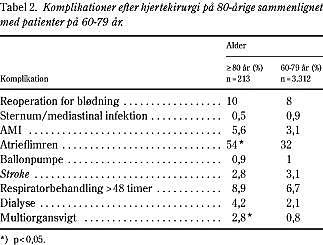 De hyppigste postoperative komplikationer fremgår af Tabel 2 , hvor forekomsten af komplikationer hos patienter over 79 år er sammenlignet med forekomsten af komplikationer hos patienter på 60-79 år, der blev opereret i samme periode. Der fandtes signifikant flere patienter med postoperativ atrieflimren og flere tilfælde af multiorgansvigt hos patienter over 79 år.
