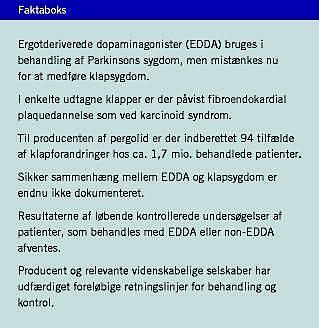 Selv om det således kan forekomme plausibelt, må sammenhængen mellem pergolidbehandling og hjerteklapsygdom endnu betragtes som utilstrækkeligt dokumenteret. I det belgiske studie [2] fandtes klapaffektion hos 33% af de pergolidbehandlede patienter; denne andel forekommer at være meget høj. Sværere restriktiv klappåvirkning fandtes hos 15 patienter (19%). Definitionen af restriktiv klapsygdom beroede imidlertid hovedsageligt på et subjektivt skøn. Atrioventrikulærklapperne blev beskrevet som restriktive, når klapbevægelsen forekom at være stivere end normalt, eller klapfligene syntes at være apikalt retraheret. For mitralklappen søgtes denne retraktion hos en undergruppe af patienterne kvantificeret ved øget tenting area mellem de to flige og annulus. Samlet fandtes påvirkning af mitralklappen hos 20 patienter, mens aortaklappen og tricuspidalklappen var afficeret hos syv henholdsvis seks patienter. Hos seks patienter fandtes indikation for ophør med pergolidbehandling, og hos to efterfulgtes dette af nogen regression af klapforandringerne. Kun en enkelt patient i det belgiske arbejde fik behov for klapsubstitution. Med den høje forekomst af hjerteklapaffektion på 33% kan det undre, at sammentræf af EDDA og klapsygdom tidligere kun er beskrevet i få enkeltstående tilfælde. Hyppigheden af klapforandringer skal også sammenholdes med forekomsten hos baggrundsbefolkningen. Ganske vist fandtes klapsygdom slet ikke i en mindre kontrolgruppe på 18 parkinsonismepatienter, som ikke var behandlet med EDDA i det belgiske studie [2], men i en dansk undersøgelse er der påvist klapfejl hos ca. 30% af knap 3.000 uselekterede patienter, der var indlagt på Amager Hospital [8].