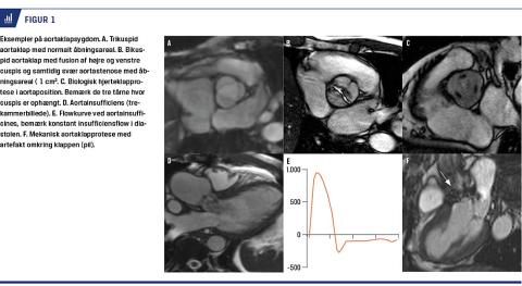 AS er hyppig hos ældre patienter med trikuspid aortaklap (1-2% over 65 år). Hos patienter med bikuspid aortaklap (0,5-1,0%) opstår AS tidligere i livet og med højere incidens (og evt. aortainsufficiens (AI)), og patienterne må ofte opereres tidligere. Med CMR visualiseres forkalkninger (f.eks. på klapper) ikke så godt som med ekkokardiografi og CT, men CMR kan benyttes til visualisering af klappen og vurdering af stenosegradient ved suboptimalt ekkovindue (Figur 1A + B), om end man med CMR undervurderer stenosegraden ud fra ligevægtsligningen. Koronarpatologi vurderes med koronarangiografi eller koronar-CT da man med CMR ikke kan visualisere koronarkar, med CMR kan man derimod foretage myokardieperfusionsskanninger [6]. CMR benyttes rutinemæssigt til opfølgning af patienter med bikuspid aortaklap (Figur 1B), hvor vurdering af ledsagende medfødt hjertesygdom, herunder ofte hypoplastisk aortabue og coarctatio, er nødvendig. Hos disse ofte yngre patienter ønsker man at følge aorta ascendens’ dimensioner grundet risiko for aortadissektion uden brug af ioniserende stråling (jf. bikuspid aortaklap-relateret aortopati). Man undersøger klappens morfologi og venstre ventrikels (LV) vægtykkelse, størrelse og kontraktile og diastoliske funktion [1]. Et aortaklapåbningsareal < 1,0 cm2 betragtes som udtryk for svær AS [7-10]. Ledsagende iskæmisk hjertesygdom kan bedømmes med gadoliniumteknik, og i forskningssammenhæng vurderer man diffus myokardiefibrose, der er et dårligt prognostisk tegn og ofte ses ved AS særligt i den basale (mitralklapnære) del af LV-myokardium [11, 12].