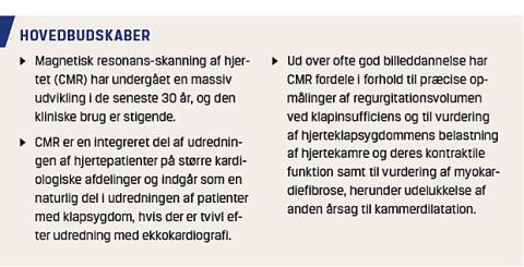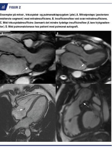 I udvalgte tilfælde suppleres ekkokardiografi med MR-skanning af hjertet (CMR), hvilket har fordele særligt inden for kvantificering af klapinsufficiens (herunder nøjagtig kvantificering af ReVol) og til generel vurdering af klapdefektens indflydelse på tilstødende kamre inkl. nøjagtig vurdering af hjertekammervoluminer, hjertekammerfunktion, myokardiemasse og evt. myokardiefibrose. CMR-filmsekvenser har høj naturlig kontrast mellem blod, klapmateriale og myocardium og er guldstandard til evaluering af hjertekamrenes volumen og uddrivningsfraktion samt myokardiemasse, der alle vurderes i forhold til publicerede normalmaterialer [4]. I forhold til ekkokardiografi er CMR særlig velegnet til vurdering af højresidige hjertekamres volumen, der pga. kamrenes anatomi ellers er vanskelige at kvantificere korrekt med ekkokardiografi. Med CMR opgøres flow og stenosegradient over klapper med fasekontrasthastighedteknik, idet man med CMR særlig nøjagtigt kan bestemme fremadrettet slagvolumen og bagudrettet regurgitationsvolumen (ReVol) ved måling umiddelbart over aorta- eller pulmonalklapper. CMR har lavere tidsopløselighed end ekko-Doppler, og trykgradienter kan derfor undervurderes med CMR. Skanning efter indgift af gadoliniumholdige kontraststoffer (forbeholdt patienter med estimeret glomerulær filtrationsrate > 30 ml/min/1,73 m2 [5] benyttes til påvisning af områder af myokardiet med enten lokaliseret (LGE) eller mere diffus fibrose (T1-mapping, evt. gadoliniumkontrastfrit). I denne artikel præsenteres en oversigt over anvendelsen af CMR ved undersøgelse af patienter med hjerteklapsygdom.
