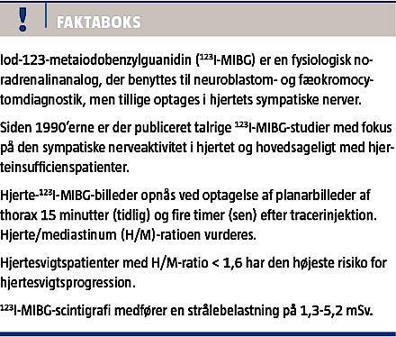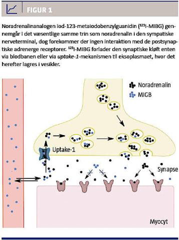 historisk set helt overvejende udført med iod-123-metaiodobenzylguanidin (123I-MIBG), som er en gammakamerabaseret tracer. 123I-MIBG er en fysiologisk noradrenalinanalog, der oprindelig blev udviklet i 1970’erne til visualisering af binyrens medulla og fortsat benyttes blandt andet til neuroblastom- og fæokromocytomdiagnostik, men 123I-MIBG optages tillige i hjertets sympatiske nerver. Ved kemisk modifikation af guanetidin, som er en falsk neurotransmitter og NA-analog, produceres der MIBG, der også optages via den præsynaptiske uptake-1-mekanisme. Denne kemiske forbindelse kan mærkes med radioaktiv 123I, men i modsætning til NA kataboliseres MIBG ikke af monaminoxidase, og MIBG opkoncentreres i de præsynaptiske nerveender, hvilket muliggør billeddannelse med et almindeligt gammakamera [10]. Der findes forskellige 11C- og 18F-mærkede PET-tracer-NA-analoger [11]. En fordel ved PET-tracere er muligheden for absolut kvantificering og bedre billedkvalitet.