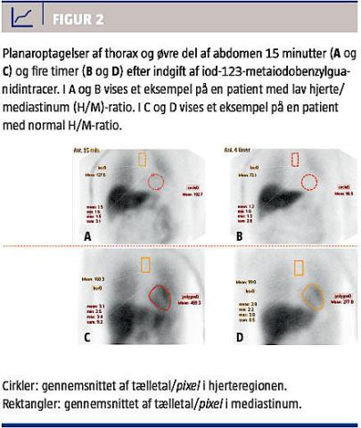 Den tidlige H/M-ratio, der bestemmes ved optagelsen 15 minutter efter tracerinjektion, menes at afspejle den anatomiske fordeling af de sympatiske nerver i hjertet. Den sene H/M-ratio afspejler derimod de sympatiske neuroners funktionelle integritet, og det er denne ratio, der har størst klinisk bevågenhed. Normalværdier for den sene H/M-ratio (fire timer efter tracerinjektion) er 2,2 ± 0,3, hvor værdier < 1,6 anses for patologiske (Figur 2). Det er dog påvist, at normalværdier varierer med køn, alder og BMI. Også specielle optagetekniske variable, som forskelle i kollimatorer, tracers mærkningsgrad m.m. påvirker H/M-ratioen [10, 15].