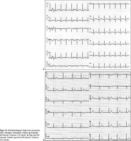 En 46-årig, tidligere rask, lettere overvægtig, naturligt udseende kvinde blev indlagt på et sygehus efter synkope. Blodprøver inklusive måling af kalium og glukose viste normale forhold. En CT af cerebrum viste normale forhold. Ekg viste sinusrytme (SR), man bemærkede affladigede T-takker, men ellers fandtes intet abnormt. Patienten blev udskrevet efter et døgns observation uden videre opfølgning. Tre uger senere blev hun indbragt på vort sygehus efter klinisk hjertestop. Ved lægeambulancens ankomst konstateredes ventrikelflimmer, der blev konverteret til sinusrytme efter et enkelt direct current (DC)-stød. Patienten var ved ankomsten til sygehuset vågen og cerebralt intakt. Blodtrykket var på 129/69, og perifier saturation var 95%. Biokemisk fandtes der hypokaliæmi (S-kalium 1,9 mmol/l) ellers normale forhold ved standardblodprøver inkl. kreatinkinase-MB. Et ekg viste SR og abnormt forlængede og affladigede T-takker (Figur 1A ). QT-interval/QTc (hjertefrekvenskorrigeret QT-interval) var forlænget til henholdsvis 480 ms og 590 ms. Patienten blev observeret under telemetri og frembød ingen arytmi. Hypokaliæmi blev korrigeret og et ekg viste normaliserede forhold (Figur 1B ). Ekkokardiografi, arbejdstest og CT af cerebrum viste alle normale forhold.