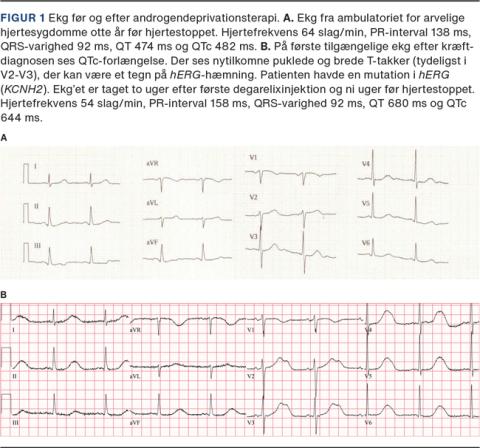 Prostatakræft er en af de mest almindelige kræfttyper blandt mænd, og ved metastasering er kemisk kastrering ved hjælp af androgendeprivationsterapi central i behandlingen [1]. Visse af disse præparater kan øge varigheden af QT-intervallet [2]. Langt QT-syndrom (LQTS) er en sjælden, arvelig hjertesygdom, men mandlige patienter med LQTS vil fra tid til anden blive diagnosticeret med metastatisk prostatakræft. I disse tilfælde er det vigtigt at være opmærksom på risikoen for yderligere QT-forlængelse og dermed øget risiko for letale arytmier [3].