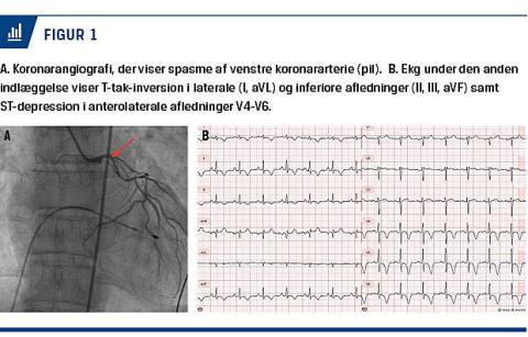 En 41-årig kvindelig ryger, der tidligere havde haft migræne og hypertension, blev indlagt efter et hjertestop. Endvidere havde hun familiær disposition til kardiovaskulær sygdom og var tidligere blevet udredt for atypiske brystsmerter med ekg og CT-koronarangiografi, som viste normale forhold. Forud for hjertestoppet havde hun indtaget 200 mg mifepriston oralt og 0,8 mg misoprostol vaginalt for at inducere en medicinsk abort i sjette uge. Efter en time fik hun brystsmerter med udstråling til venstre arm. Hun fik herefter hjertestop og blev genoplivet med DC-konvertering og intravenøst givet adrenalin. På hospitalet udførte man koronarangiografi, som viste svær koronarspasme (Figur 1A). Der blev givet nitroglycerin intrakoronart, hvorefter tilstanden remitterede. Et efterfølgende ekg viste T-takinversion i de inferiore og anterolaterale afledninger. Ved en intravaginal ultralydundersøgelse bekræftede man, at aborten var fuldendt. Patienten fik ingen neurologiske eller kardiologiske men. Hun blev instrueret i rygestop og anbefalet at undgå misoprostol.