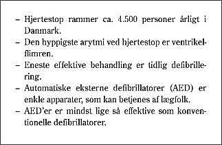 Hjertestop uden for hospital rammer skønsmæssigt 4.500 personer årligt i Danmark. Af disse overlever kun få procent til udskrivelse. Den primære arytmi er hyppigst ventrikelflimren, hvor den eneste dokumenterede behandling er hurtig ekstern defibrillering. Automatiske eksterne defibrillatorer (AED) er små, enkle apparater, som har vist sig at være mindst lige så effektive som traditionelle monofasiske defibrillatorer. Der foreligger dokumentation for forbedret overlevelse efter hjertestop med anvendelse af AED'er med udskrivningsrate i god neurologisk status på op til 60%, forudsat at den nødvendige logistik er til stede. Større udbredelse af AED'er stiller sundhedsvæsenet over for en række væsentlige spørgsmål af bl.a. organisatorisk, logistisk, uddannelsesmæssig og juridisk art, som omhyggeligt bør diskuteres og afklares.