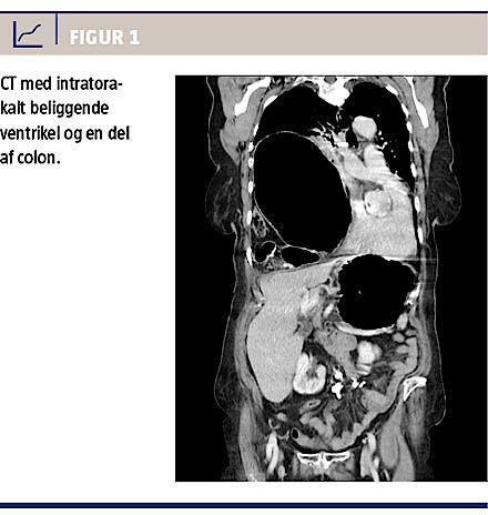 med herniering af ventriklen gennem defekten i diafragma, senest en måned forud for dette forløb. Symptomerne var åndenød, svære øvre abdominalsmerter og opkastninger. En CT viste en intratorakalt beliggende ventrikel og en del af colon (Figur 1). Man behandlede tilstanden konservativt med ventrikelsonde, og hun blev udskrevet til planlagt operation en måned senere. Der blev foretaget laparoskopisk procedure, hvor man i diafragma fandt en 10 × 5 cm stor defekt, som var lokaliseret anteriort og til venstre for hiatus oesophageus. Der var herniering af ventriklen, højre del af colon og en større del af tyndtarmen i højre hemithorax. Indholdet kunne umiddelbart reponeres. Defekten i diafragma dækkede man med en Bard Composit E/X-meche (10,2 × 15,2 cm) og fæstnede den dels med Protacs (5 mm), dels med Goretexsutur. Grundet vævstensionen og defektens alder var det ikke muligt at adaptere kanterne med sutur alene.