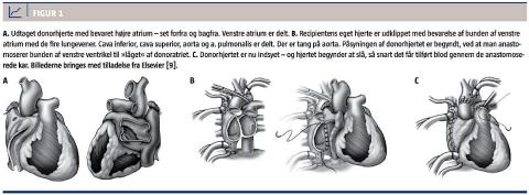 Recipient og donor skal være kompatible med hensyn til AB0-systemet og matche acceptabelt i størrelse. Hvis recipienten har præformerede HLA-antistoffer, skal der, når der foreligger et muligt organtilbud, udføres en såkaldt cross-match-undersøgelse for at dokumentere forligelighed mellem donorlymfocytter og recipientserum, inden operationen påbegyndes. Selve den kirurgiske teknik er ændret i løbet af det seneste årti. Den tidligere anvendte biatriale metode er forladt til fordel for den bikavale teknik, hvor hele højre atrium fra donor medtages, hvilket medfører mindre tendens til atrial dilatation, mindre behov for pacemakerimplantation og muligvis bedre overlevelse [8] (Figur 1). Hjertetransplantation er fortsat et omfattende kirurgisk indgreb, ofte af 4-6 timers varighed. Patienterne behandles rutinemæssigt med inotropi og kardial pacing i de første postoperative døgn. På trods heraf kan mange elektive patienter ekstuberes inden for et døgn efter operationen.