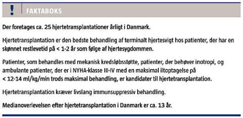 Overlevelsen efter hjertetransplantation er bedret betydeligt i de seneste decennier på trods af udvælgelse af ældre og mere syge recipienter og anvendelse af ældre donorhjerter [3]. Forklaringen på den bedrede prognose skal søges i forbedrede kirurgiske teknikker og forbedret immunsuppressiv behandling. I en nyligt publiceret opgørelse af prognosen efter hjertetransplantation fra de skandinaviske centre påvistes en medianoverlevelse på 13,2 år, hvilket er sammenligneligt eller bedre end tal fra det internationale transplantationsregister [2, 3].