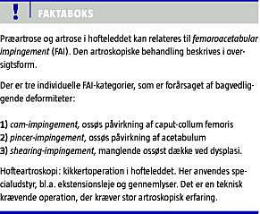 Et nyt indikationsområde, der er beskrevet inden for de seneste 3-5 år, er femoroacetabular impingement (FAI) [15-17]. FAI medfører mikrotraumatisering i kontaktzonen mellem lårbenshals og ledskål i fleksion.