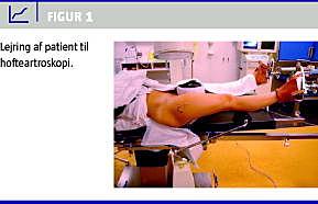 Patienten lejres på et velpolstret specialleje på operationsstuen, og med patienten i generel anæstesi anlægges så meget stræk som nødvendigt for at skabe den fornødne plads til at artroskopere og arbejde i leddet. Adgang til hofteleddet etableres vejledt af røntgengennemlysning (Figur 1 ). Herefter slippes strækket, og hoften bøjes til ca. 45° for at få adgang til det perifere kompartment. Indgrebet udføres som dagkirurgisk indgreb. Patienterne udstyres med krykkestokke og mobiliseres med vægtbæring inden for smertegrænsen. De fleste patienter slipper krykkestokkene efter 2-4 uger. Der er som regel et genoptræningsforløb på tre måneder postoperativt.