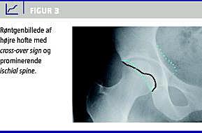 Ved ossøs påvirkning af acetabulum tales der om pincer-impingement (knibtang). Der findes to komplekse deformiteter af acetabulum, der kan udløse impingement : Den ene er coxae profunda, hvor den normale center-edge -vinkel (CE-vinkel) er patologisk forøget (> 35°). Den anden deformitet er retroverteret acetabulum, hvor acetabulums forvæg er væsentligt større end acetabulums bagvæg. Det kan ses som det såkaldte ottetalsfænomen (cross-over sign SPAN> ) på anterior-posterior-røntgenoptagelser eller ved prominens ind i bækkenet af ischial spine [21]. (Figur 3 ). Pincer impingement leder til skade på labrum, der kan slides løs eller calcificere. Der er oftest tale om mixed type -patologi ved FAI [18].