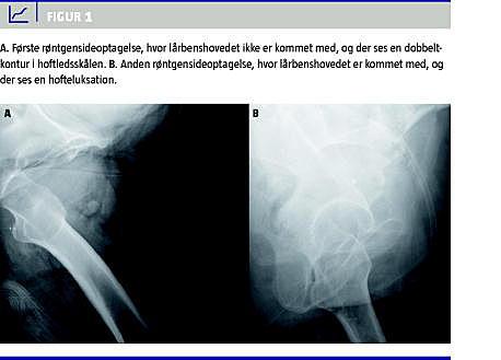 Ved dislokeret benstilling bør man overveje diagnosen hofteluksation. Det vides, at hoftefrakturer forekommer hyppigt hos ældre mennesker, og eftersom traumemekanismen i dette tilfælde var forenelig med en hoftenær fraktur, var det nærliggende at have mistanke om dette. På baggrund af de ufuldkomne første røntgenoptagelser i aksialplanet kunne man endvidere foranlediges til at tro, at det drejede sig om en caputfraktur pga. en dobbeltkontur i hofteledsskålen (Figur 1 ).