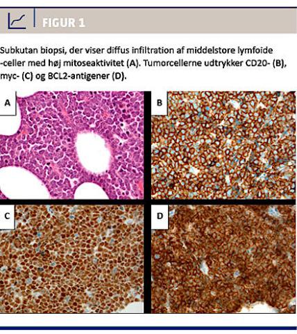 En 63-årig kvinde blev henvist til et reumatologisk ambulatorium med fire uger varende højresidige hoftesmerter. Smerterne var konstante og stærke. En røntgenundersøgelse af hofte og bækken viste normale forhold. Objektivt var der ingen tegn på artritis, men smertebetinget bevægeindskrænkning. Paraklinisk blev der fundet følgende værdier: leuocytter 10,4 × 109/l, C-reaktivt protein 47 mg/l og trombocytter 110 × 109/l. Fire dage senere blev patienten indlagt til observation for kolecystitis. En UL-skanning af abdomen viste supracapsulær proces ved højre nyres øvre pol. En CT-urografi viste tre patologisk forstørrede lymfeknuder centralt i retroperitoneum. En biopsi viste aggressivt B-celle-lymfom intermediært mellem diffust storcellet B-celle-lymfom og Burkitts lymfom (Figur 1) med fluorescens in situ-hybridisering-påvist translokation af både MYC og BCL2, altså et DHL. Stadieudredning viste udbredt sygdom med involvering af bl.a. flere lymfeknuderegioner, knoglemarv, subcutis og myokardium svarende til Ann Arbor-stadium 4B. Der blev påbegyndt intensiv kemoterapi, og en måned efter var smerterne i hoften forsvundet. Med kemoterapien blev der opnået komplet remission, men sygdommen recidiverede kort efter i centralnervesystemet, og efter i alt 11 måneders sygdom gik patienten ad mortem.