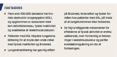 Formålet med denne artikel er at gennemgå den nyeste viden om genoprettelse og vedligeholdelse af fysisk aktivitet gennem lungerehabiliteringsprogrammer hos patienter med stabil KOL og at diskutere, hvilken betydning det har for prognosen at vedligeholde et højt fysisk aktivitetsniveau. Vi vil også diskutere mulige mekanismer bag de positive effekter af fysisk aktivitet og fremtidige forskningsperspektiver.