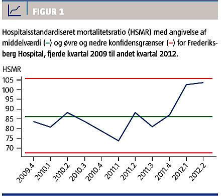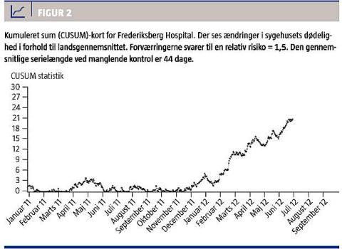 Frederiksberg Hospital (FH) har i de seneste år haft en lav HSMR. I første og andet kvartal i 2012 var der imidlertid en markant højere HSMR (Figur 1). Kumuleret sum (CUSUM)-kortet (Figur 2) viser ændringer i dødeligheden på Frederiksberg Hospital i forhold til landsgennemsnittet i 2010. Hvis kontrolgrænsen krydses, er det et signal om, at dødeligheden med stor sandsynlighed er steget til 50% over landsgennemsnittet, hvorfor yderligere undersøgelser bør overvejes [3].