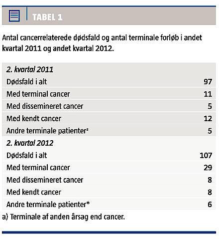 nemgangen viste, at der blandt dødsfald i andet kvartal 2012 var 29 terminale og otte disseminerede cancertilfælde og hhv. 11 og fem i andet kvartal 2011 (Tabel 1). Vi fandt således 18 flere terminale cancerforløb i andet kvartal 2012 end i andet kvartal 2011. Hvis antallet af dødsfald blandt patienter med terminal cancer havde været det samme i 2012 som i 2011, ville HSMR have været 86, og der havde dermed ikke været tegn på stigning.