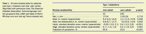 Det er velkendt, at cøliaki findes med en overhyppighed ved forskellige autoimmune sygdomme, specielt type 1-diabetes (T1D). I en række studier fra europæiske lande har man påvist en prævalens af cøliaki hos børn og unge med T1D på 2-8% [1]. I Danmark er prævalensen af diagnosticerede tilfælde af cøliaki i den almene befolkning lav sammenlignet med prævalensen i vore nabolande [2].
