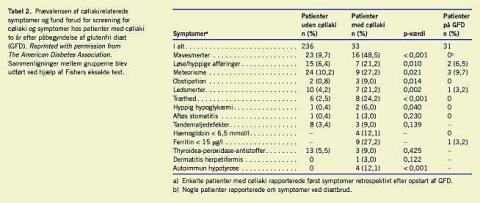 I Tabel 1 ses kliniske karakteristika hos diabetikere med cøliaki sammenlignet med diabetikere uden cøliaki. Patienter med cøliaki havde en signifikant lavere alder ved diabetesdebut (p = 0,042), mens der ikke var nogen forskel ved sammenligning af alder og køn i de to grupper. Patienter med cøliaki havde desuden en signifikant lavere højde-standard deviation score (SDS) (p < 0,001) og vægt-SDS (p = 0,002). Ved inklusion i undersøgelsen rapporterede patienter med cøliaki om symptomer signifikant oftere (p < 0,001) end patienter uden cøliaki. I Tabel 2 ses prævalensen af cøliakirelaterede symptomer i de to grupper. Hos fire patienter med cøliaki blev symptomerne først erkendt retrospektivt, efter GFD var startet op. Kun fem af 33 (15%) patienter med cøliaki havde ingen symptomer på sygdommen.