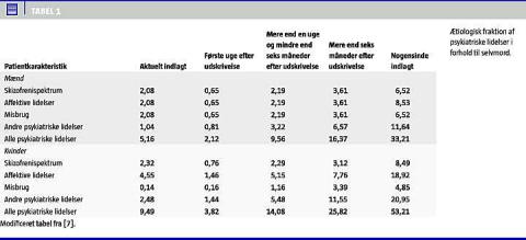 Patienter, som mindst en gang tidligere har været indlagt på en psykiatrisk afdeling, tegner sig for omkring halvdelen af selvmordene i Danmark [1, 2]. I såkaldte psykologiske autopsiundersøgelser, hvor man efter dødsfaldet udnytter tilgængelige kilder som medicinske journaler, pårørendeinterview og politirapporter, når man ønsker at stille en eventuel psykiatrisk diagnose, finder man imidlertid, at over 90% af dem, der er døde ved selvmord, har en psykiatrisk lidelse [3]. Patienter med psykisk sygdom udgør den største og vigtigste risikogruppe for selvmord. Selvmordsrisikoen for en patient, som har været indlagt på en psykiatrisk afdeling, er forhøjet med gennemsnitligt en faktor 20 i forhold til baggrundsbefolkningen, næsten uanset hvilken diagnose vedkommende har været indlagt under [4, 5]. Selvmordsrisikoen er stærk forhøjet ved samtlige psykiske lidelser, men den er højest ved affektiv lidelse og skizofreni. I en ny dansk undersøgelse af langtidsrisikoen for selvmord blev det påvist, at ca. 6% af mændene og 4% af kvinderne med psykiatriske sygdomme døde ved selvmord [6]. I samme undersøgelse fandt man, at risikoen var fordoblet, hvis patienterne foruden en psykisk sygdom havde været indlagt på grund af selvmordsforsøg. Selvmordsrisikoen er højest under indlæggelse og i den første kritiske periode kort tid efter udskrivelse [7]. Den ætiologiske fraktion af psykiatriske lidelser er vist i Tabel 1 . For mænd er den ætiologiske fraktion 33%. Det indebærer, at hvis man hypotetisk kunne nedsætte risikoen for selvmord blandt mænd, som har været indlagt med en psykiatrisk lidelse, til baggrundsbefolkningens niveau, kunne man reducere selvmordstallet med 33%. Det tilsvarende tal for kvinder er 53%, hvilket formentligt afspejler, at kvinder i højere grad end mænd søger og får hjælp ved psykiatrisk sygdom. Det fremgår også af Tabel 1, at personer med affektive lidelser, både mænd og kvinder, tegner sig for en betydelig del af det samlede selvmordstal.