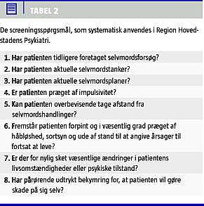 Personalet i psykiatrien skal regelmæssigt undervises og superviseres i selvmordsproblematikken, og der bør være procedurer, der sikrer, at psykiatriske patienter systematisk undersøges for selvmordsrisiko, i det mindste når de henvender sig til en psykiatrisk afdeling og forud for udskrivelse. I Tabel 2 er oplistet de screeningsspørgsmål, som systematisk anvendes i Region Hovedstadens Psykiatri.