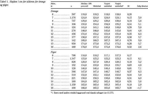 Kurver for højde for alder hos skolebørn til afløsning for referenceværdier fra 1950 (2) blev publiceret af Andersen et al i 1974 på baggrund af målinger af 11.000 børn fra skoleåret 1971/1972 (3). Disse kurver eller svenske kurver fra samme periode (4) bruges i dag i skolerne. Flere har rapporteret, at danske skolebørn er højere for alderen nu end i 1971/1972 (5-7), og det oplyses jævnligt fra kommunallæger og sundhedsplejersker, at eleverne er højere end angivet i de vækstkurver, der anvendes i skolerne. Formålet med denne undersøgelse var at sammenligne gennemsnitshøjden for børn i perioden 1986/1987 til 1996/1997 med tidligere rapporterede gennemsnitsværdier. Resultatet af undersøgelsen kan bidrage til at belyse behovet for nye vækstkurver.