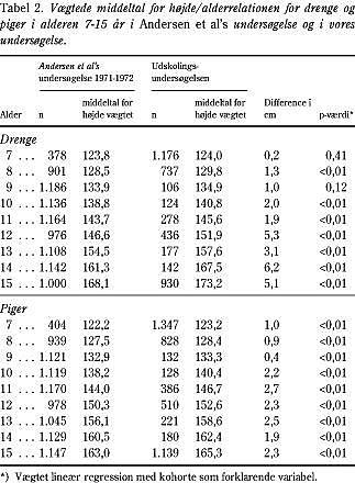 I 1989 publicerede Roed et al resultater fra Østerbroundersøgelsens børneundersøgelser i 1981 og 1985 og fandt en stigning i gennemsnitshøjden på mere end 3 cm for både drenge og piger i alderen 7-15 år fra 1971/1972 frem til 1981, hvilket svarede til, at gennemsnitshøjderne i Roed et al's materiale stort set fulgte 75%-percentilerne i Andersen et al's undersøgelse (5). I vores undersøgelse var eleverne højere for alderen end eleverne i den landsrepræsentative undersøgelse fra 1971/1972, men lavere end i den lille stikprøve af børn fra Østerbroundersøgelsen (Fig. 1 ). Forskellen i forhold til Andersen et al's resultater kunne skyldes skæv fordeling inden for aldersintervallerne; begge talmaterialerne er derfor vægtede efter samme princip, idet vi har haft adgang til filen med målingerne fra 1971/1972. Børnene i vores undersøgelse var signifikant højere end eleverne var i 1971/ 1972. For drengenes vedkommende fra 8-års-alderen og for pigernes vedkommende fra 7-års-alderen. Stigningen i gennemsnitshøjden i forhold til tidligere på de vægtede værdier var for drengene 1-2 cm frem til 12 års alderen, hvorefter den var 5-6 cm. For piger var stigningen i gennemsnitshøjden i forhold til tidligere mindre, ca. 1 cm i begyndelsen af skolealderen og 2-3 cm fra 10-års-alderen (Tabel 2, Fig. 1).