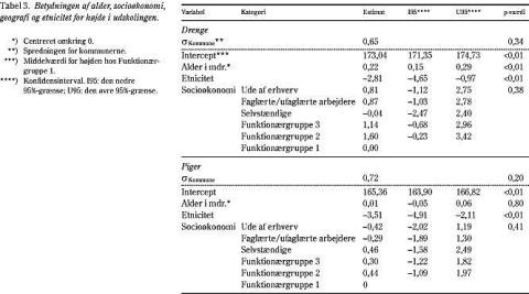 I Tabel 3 findes resultaterne fra en regressionsanalyse med kommune, socioøkonomi (moderens), etnicitet og alder som forklarende variable. Den viste ingen forskel i højden på 14-16-årige imellem kommunerne. Højden viste sammenhæng med alderen for 14-16-årige drenge, men ikke for piger, hvilket kan tages som et udtryk for, at pigerne i denne alder er næsten udvoksede. Moderns socioøkonomiske forhold fandtes at være uden betydning for højden, men etnicitet var af betydning, idet drenge og piger med anden etnisk baggrund end dansk var henholdsvis 2-3 cm og 3-4 cm mindre end unge med dansk baggrund (Tabel 3).