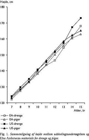 Undersøgelsens værdier for gennemsnitshøjde er dannet ud fra en række målinger på en gruppe børn i perioden 1986/1987 til 1996/1997. Tidsafstanden til Andersen et al's semilongitudinale undersøgelse fra 1971/1972 var 15 år for skolebegynderne og 25 år for de ældste elever. Hvis gennemsnitshøjden er øget i observationsperioden, vil de ældste elever alt andet lige være højere end børnene fra 1971/1972 end de yngste elever vil være. Forskellen i højde i forhold til tidligere var størst fra omkring det tidspunkt, hvor børnenes vækstspurt begynder. I 16-års-alderen var forskellen mindre, hvilket tyder på, at elevernes højde i denne alder nærmer sig værdierne fra 1971/1972 (Tabel 2, Fig. 1). Elevernes sluthøjde kan ikke vurderes ud fra denne undersøgelse. Gennemsnitshøjden på unge mænd, der er til session har fra 1990 til 2000 ligget omkring 180 cm. I Statens Institut for Folkesundheds sundheds- og sygelighedsundersøgelse fra 1994 var gennemsnitshøjden for 18-24-årige kvinder 168 cm (selvrapporteret).
