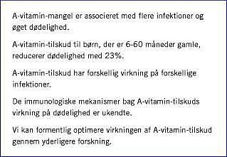 Imidlertid blev den amerikanske øjenlæge Alfred Sommer i 1980'erne ved et tilfælde opmærksom på, at indonesiske børn med selv mild xeroftalmi havde en høj forekomst af diare og luftvejsinfektioner og en meget høj dødelighed. A-vitamin-status syntes at være endnu vigtigere for dødelighed end underernæring, faktisk havde underernærede børn uden xeroftalmi mindre risiko for at dø end velnærede børn med mild xeroftalmi [3]. Opdagelsen ledte til fornyet interesse for A-vitamins virkning på immunforsvaret og førte til mange spændende fund. I denne artikel opsummeres, hvad vi ved, og hvad vi endnu ikke forstår om A-vitamins virkning på børnedødelighed i lavindkomstlande.