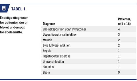 I alt blev 15 personer (ni mænd og seks kvinder i alderen 23-57 år) i perioden juli 2014-april 2015 undersøgt for ebola i Danmark, ti på Aarhus Universitetshospital og fem på Hvidovre Hospital. Hovedparten af de undersøgte havde opholdt sig i Sierra Leone som sundhedspersonale som en del af det danske bidrag til bekæmpelse af ebola. Ingen af de 15 personer havde organpåvirkning i en grad, hvor assistance fra anæstesi-/intensivpersonale var påkrævet. Ingen af de 15 personer var indlagt i højisolation ud over 48 timer, og diagnosen blev afkræftet i alle tilfælde (Tabel 1).