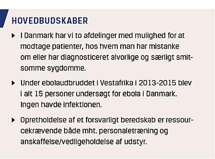 Ten and seven years ago respectively, the two high-isolation units in Denmark became prepared to receive highly con­tagious and potential severely ill patients. The units are located in the departments of infectious diseases in Hvid­ovre Hospital and Aarhus University Hospital. Both depart­ments had little experience until the Ebola outbreak in West Africa, 2013-2015. Altogether, 15 possible Ebola patients were examined in the two departments, but the diagnosis was ruled out for all of them. Besides, a few possible candidates for Middle East respiratory syndrome patients were exami­ned. Always being prepared in a busy clinical everyday en­vi­r­­onment is a challenge, and it takes regular training and exercises involving all personnel.