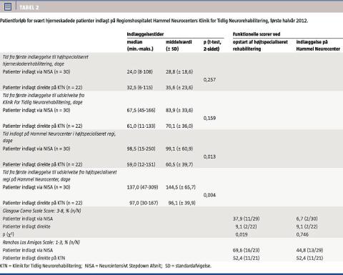 indlæggelsesforløb. Dette kan til dels skyldes en selektionsbias som følge af visitationspraksis, hvor de sværest skadede patienter visiteres til NISA. Man har i Norge gennemført et prospektivt studie på et niveau I-traumecenter [4], hvor to senge dedikeredes til tidlig rehabilitering af patienter med svær traumatisk hjerneskade. Sengene blev fyldt efter først til mølle-princippet, hvorved patientmassen blev fordelt i to grupper. Gruppen, der fik tidlig rehabilitering på traumecenteret (median 12 dage fra skaden), havde ved 12-månedersfollowup bedre funktionelt udkomme, end gruppen, der ikke fik tidlig rehabilitering.