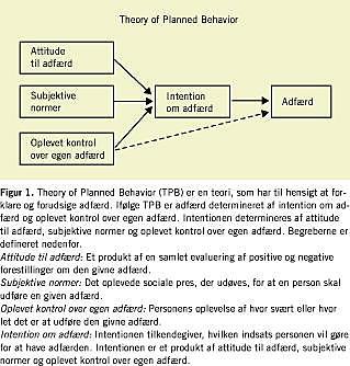 Interviewene blev foretaget ud fra en semistruktureret interviewguide udarbejdet af PROFANE-gruppen. Interviewguiden tog udgangspunkt i Theory of Planned Behavior (TPB) (Figur 1 ) [11]. Ifølge TPB er adfærd determineret af intention om adfærd og oplevet kontrol over egen adfærd. Intentionen determineres af attitude til adfærd, subjektive normer og oplevet kontrol over egen adfærd [11].
