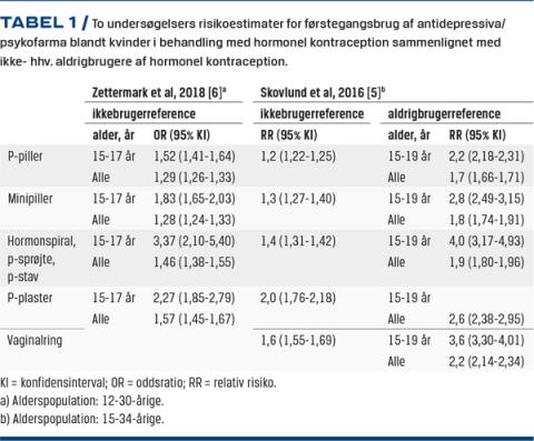 I to store skandinaviske kohortestudier undersøgte man sammenhængen mellem risikoen for at få depression og brugen af antidepressiva hos kvinder, som anvendte HC [5, 6]. I det danske registerbaserede kohortestudie fulgte man 1.061.997 kvinder i alderen 15-34 år gennem 14 år, mens man i det svenske kohortestudie fulgte 815.622 kvinder i alderen 12-34 år gennem et år. I begge studier konkluderede man, at risikoen for udvikling af depression var forøget hos kvinder, der var i behandling med orale HC, minipiller såvel som p-piller. Risikoen var i begge studier størst ved brug af rene gestagenprodukter (Tabel 1). Den relative risiko (RR) for depression blev i det danske studie estimeret til 1,3 (95% konfidens-interval (KI): 1,27-1,40) ved brug af referencegruppen ikkebrugere, og i det svenske studie rapporteredes en odds ratio (OR) på 1,28 (95% KI: 1,24-1,33) for førstegangsbrug af psykofarmaka blandt kvinder, der var i behandling med minipiller sammenholdt med ikkebrugere. I begge studier fandt man, at RR/OR for depression var størst for yngre kvinder (teenagere), og dette fund var gennemgående for brug af alle typer HC [5, 6]. Endvidere toppede risikoen for depressionsudvikling i det danske studie inden for de første seks måneder fra påbegyndelse af HC. Ved brug af p-piller blev OR for førstegangsbrug af psykofarmaka blandt 15-17-årige estimeret til 1,52 (95% KI: 1,41-1,64) i det svenske studie, mens RR i det danske studie blev rapporteret til 1,2 (95% KI: 1,22-1,25) (Tabel 1), når referencegruppen var ikkebrugere.